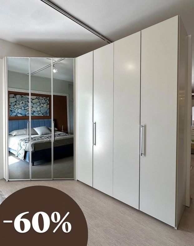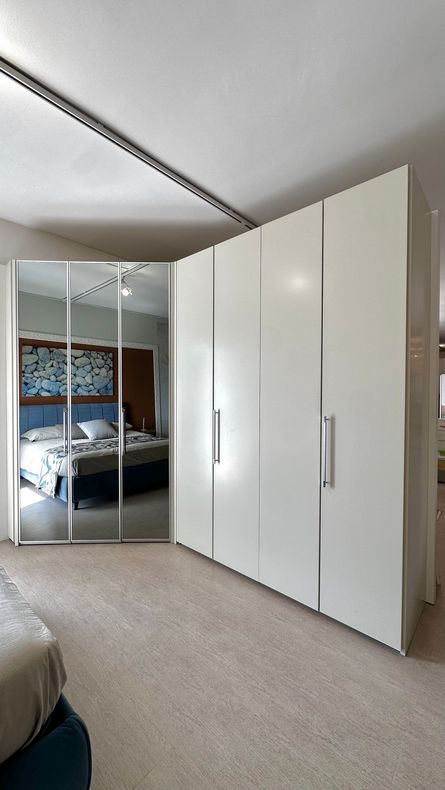 Composizione ad angolo composta da cabina obliqua con 3 ante a specchio colore fumè + armadio a 4 ante finitura bianco-grigiastro. Attrezzatura interna compresa.